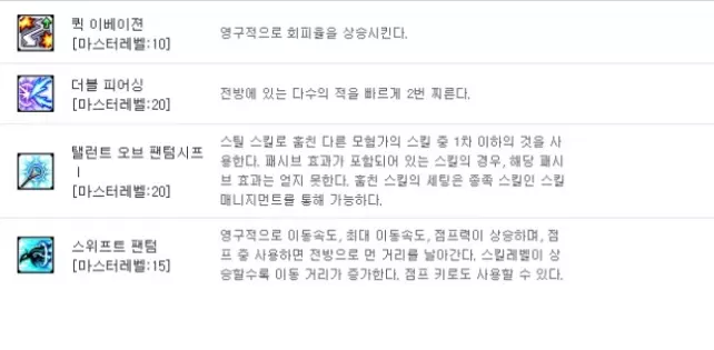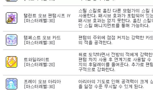콜 오브 암즈 1 - 팬텀 차지 1 - 어큐브 센스 1 - 탤런트 오브 팬텀 시프3 마스터 - 문 라이트 마스터 - 어큐트 센스 마스터 - 럭 오브 팬텀 시프 마스터 - 코트 오브 암즈 마스터 - 팬텀 차지 14 - 플래시 앤 플리 마스터 - 미스포춘 프로텍션 마스터