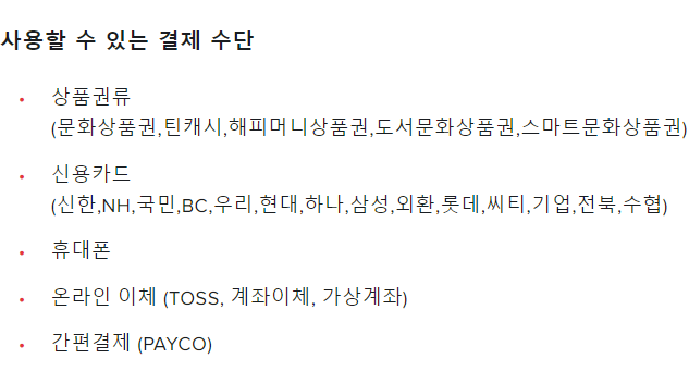 결제하는 수단은 상품권, 신용/체크 카드, 휴대폰, 온라인 결제, 간편결제 등으로 하여 쉽게 결제 하실 수 있습니다.