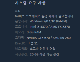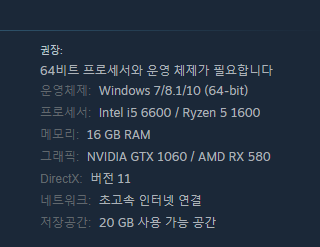 얼리얼세스이다 보니 최적화면에서 부족하다는 느낌은 아직까지 없지만 사양으로는 높은 사양을 추천하다보니 꽤 고사양의 컴퓨터가 필요할것으로 보입니다.