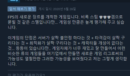 게임에 평가는 이러합니다. 대부분은 만족하는 상태이지만 소수의 부정적 평가는 서버문제와 핑이랑 관련있다 라는 평가입니다.