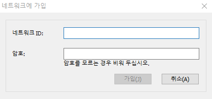 Hamachi에서 '기존 네트워크에 가입' 버튼을 눌렀다면 이런 창이 나옵니다. 자신이 들어가고자 하는 가상서버의 ID와 암호를 입력하고 하단의 '가입(J)' 버튼을 클릭하면 됩니다. 그러면 해당 가상 서버에 들어가집니다. 그 가상 서버에 속한 사람들과 IP가 같아집니다.