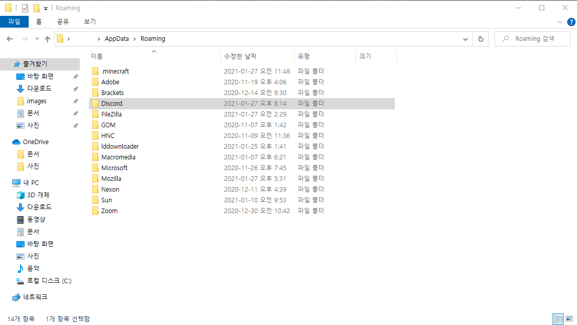 그러면 파일 경로 C:\Users\User-name(윈도우10 PC 사용자 이름)\AppData\Roming으로 이동이 됩니다. 이동된 폴더 안에 'Discord'라는 이름의 폴더가 있습니다. 그 폴더를 삭제해주세요.